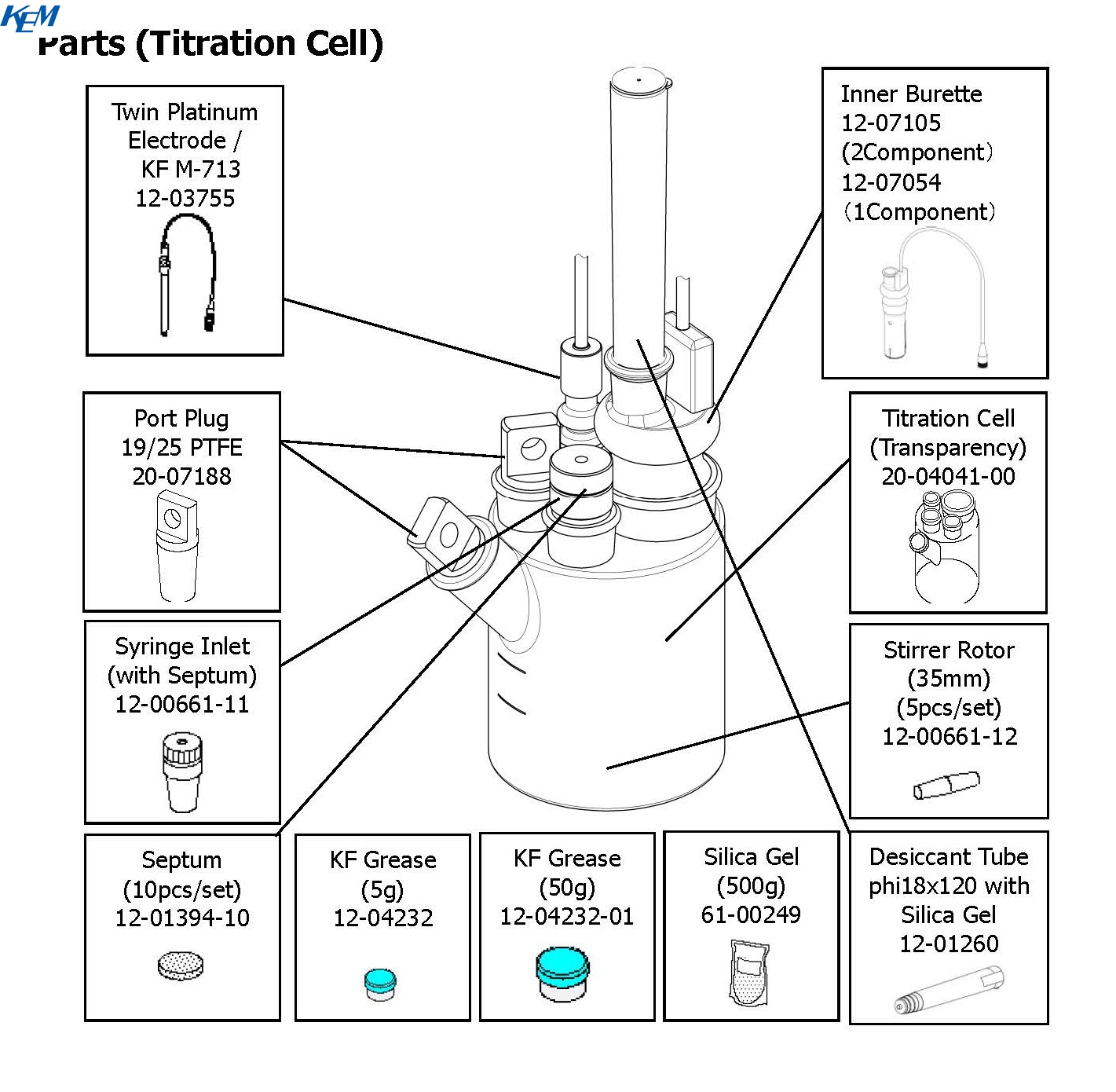 京都電子KEM推出的M-713雙白金電極(Old P/N:98103M713),零件號1203755。專為庫侖法卡爾費休水分測定儀設計,兼容MKC系列多款機型,確保精準水分分析。配套提供2液型/1液型滴定池單元、內筒電極、PTFE密封組件及滴定杯等全套配件,滿足不同實驗需求。
